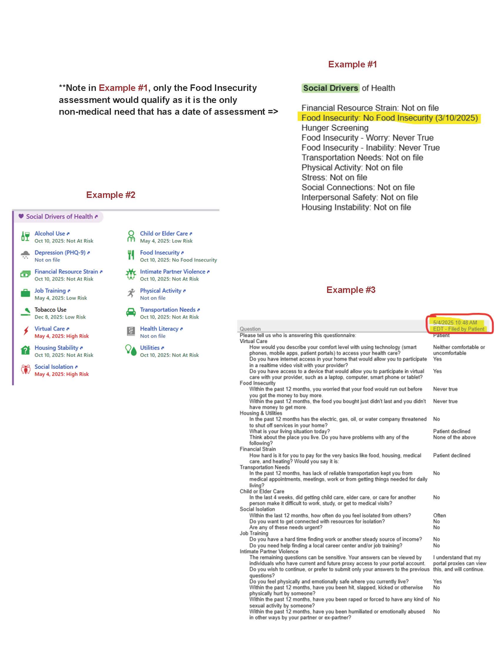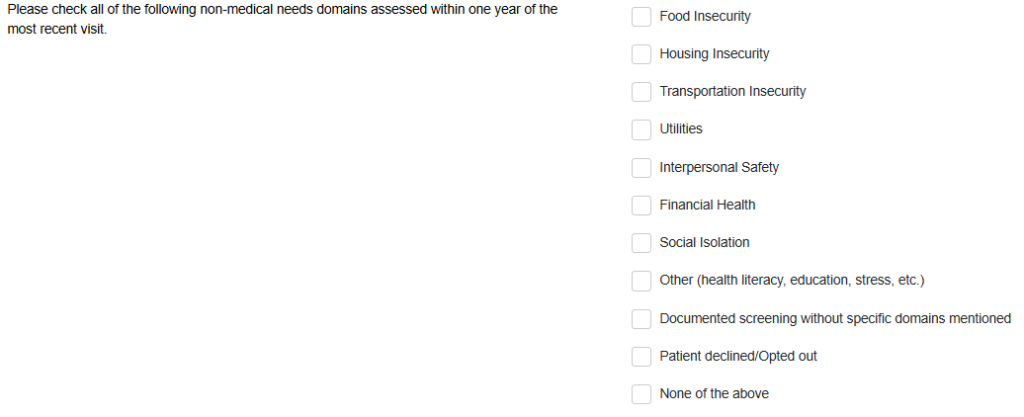 A non-medical needs assessment can be done by anyone within or outside of the practice, as long as the assessment is visible in the medical record and has been completed within one year of the last visit with the reporting practice. Example questions for each domain are located in the help text for this question. Select all that apply